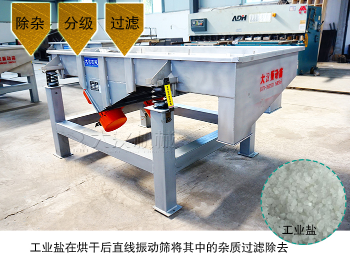 工業(yè)鹽在烘干后需要經(jīng)過(guò)皮帶輸送機(jī)輸送到料倉(cāng)中等待包裝出庫(kù),然而在皮帶機(jī)輸送料倉(cāng)的過(guò)程中,很有可能會(huì)產(chǎn)生結(jié)塊或者有異物落入工業(yè)鹽中,因此需要使用直線振動(dòng)篩將其中的雜質(zhì)過(guò)濾除去。