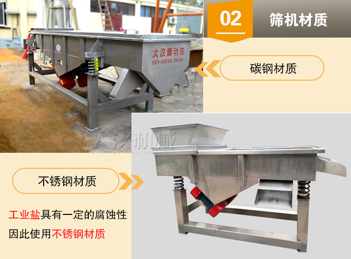 【篩機(jī)材質(zhì)】——常用的直線振動(dòng)篩有不銹鋼和碳鋼兩種材質(zhì),因?yàn)楣I(yè)鹽具有一定的腐蝕性,因此使用不銹鋼材質(zhì),使用時(shí)間更長(zhǎng),對(duì)物料也具有保護(hù)作用。