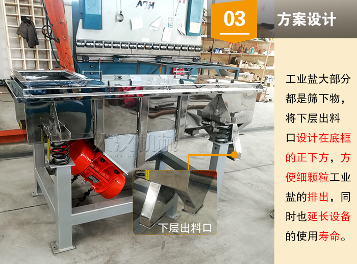 【方案設(shè)計(jì)】——工業(yè)鹽大部分都是篩下物,因此要對(duì)直線振動(dòng)篩的下出料口進(jìn)行改造,將下層出料口設(shè)計(jì)在底框的正下方,方便細(xì)顆粒工業(yè)鹽的排出,同時(shí)也延長(zhǎng)設(shè)備的使用壽命。