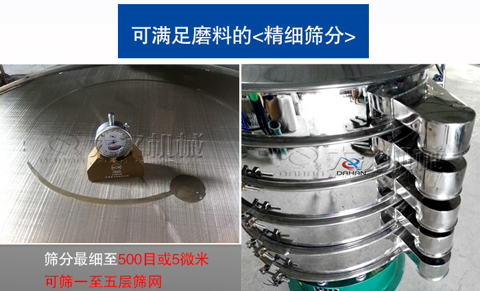 超聲波振動(dòng)篩可滿足顆粒、粉末、粘液一定范圍內(nèi)均可篩選。篩分細(xì)至500目或0.028mm, 過濾小可至5微米。分級(jí)篩選,可篩一至五層篩網(wǎng),能同時(shí)進(jìn)行二至六個(gè)等級(jí)的分選或過濾。所以對(duì)于4目—500目之間的磨料能輕松進(jìn)行精細(xì)篩分。