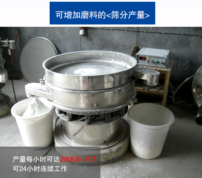 超聲波振動(dòng)篩型號(hào)是從直徑φ600mm-φ1800mm等多種標(biāo)準(zhǔn)型號(hào),可24小時(shí)連續(xù)工作,產(chǎn)量每小時(shí)可達(dá)200KG-10T,相比普通振動(dòng)篩在產(chǎn)量上可提高2-10倍,不同的型號(hào)可以滿足磨料從小到大的各種產(chǎn)量需求。