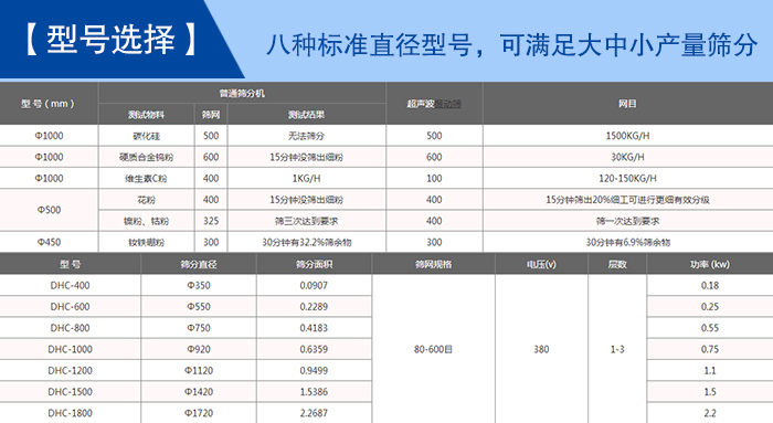 【型號選擇】—— DHC系列超聲波振動篩型號有:DHC-400、DHC-600、DHC-800、DHC-1000、DHC-1200、DHC-1500、DHC-1800、DHC-2000等八種標準直徑型號,可滿足100目—600目的細網(wǎng)篩分,每小時500KG—3000KG的大中小產(chǎn)量篩分。