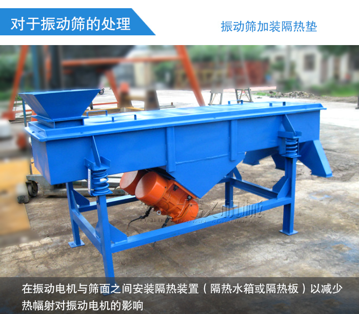 當(dāng)高溫物料直接進(jìn)入振動(dòng)篩篩箱內(nèi),回因?yàn)楦邷氐脑蛟斐烧駝?dòng)電機(jī)燒壞,從而使振動(dòng)篩不能進(jìn)行正常的篩分工作。所以在振動(dòng)電機(jī)與篩面之間安裝隔熱裝置(隔熱水箱或隔熱板)以減少熱幅射對(duì)振動(dòng)電機(jī)的影響,保證振動(dòng)電機(jī)在允許的高溫下工作。