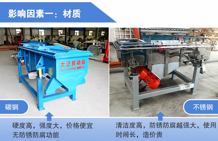 直線篩材質(zhì)分為碳鋼和不銹鋼兩種,碳鋼材質(zhì)(如:Q235)它的硬度高,強度大,價格便宜,是多行業(yè)常用的材質(zhì),但是它沒有防銹防腐功能,所以對于衛(wèi)生環(huán)境要求較高的就推薦您使用不銹鋼材質(zhì)(如:304)它的材質(zhì)清潔度高,防銹防腐越強大,不會污染物料,使用時間長,造價也相對高,所以在夠買的時候您也要根據(jù)成本預算來進行選擇。