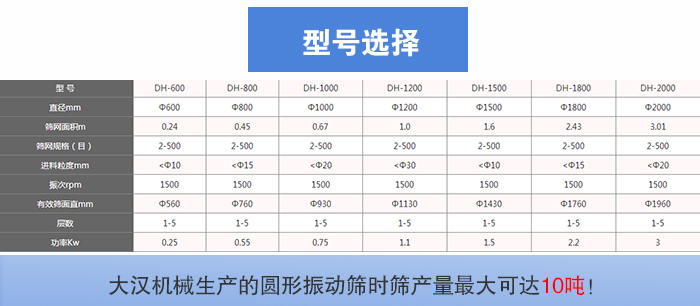 大漢機(jī)械生產(chǎn)的圓形振動篩時篩產(chǎn)量可達(dá)10噸!型號有:DH-400mm、DH-600mm、DH-800mm、DH-1000mm、DH-1200mm、DH-1500mm、DH-1800mm、DH-2000mm等八種標(biāo)準(zhǔn)型號。可滿足肥料每小時500KG—10T的大、中、小產(chǎn)量的篩分工作。