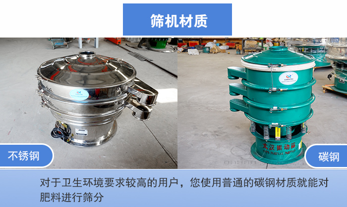 肥料篩分可用的圓形振動篩有兩種材質(zhì):碳鋼、不銹鋼;碳鋼材質(zhì)的圓形振動篩熱處理和機(jī)械性能好,價格便宜,但是長時間的使用會發(fā)生腐蝕、生銹等問題,不適合用于對衛(wèi)生行業(yè)要就較高的物料和企業(yè);而不銹鋼材質(zhì)耐酸耐堿、防腐防銹、衛(wèi)生環(huán)保,廣泛用于化工、食品、醫(yī)藥等行業(yè)。所以如果不是對于衛(wèi)生環(huán)境要求較高的用戶,您使用普通的碳鋼材質(zhì)就能對肥料進(jìn)行篩分。