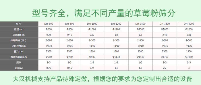 草莓粉不銹鋼旋振篩型號(直徑)有:DH-400mm、DH-600mm、DH-800mm、DH-1000mm、DH-1200mm、DH-1500mm、DH-1800mm、DH-2000mm等八種標(biāo)準(zhǔn)型號。不同型號滿足不同的草莓粉篩分產(chǎn)量,可滿足可以達到100kg/h-20t/h。同時大漢機械支持產(chǎn)品特殊定做,根據(jù)您的要求為您定制出合適的設(shè)備!