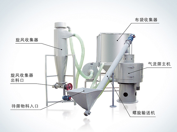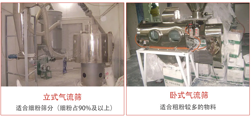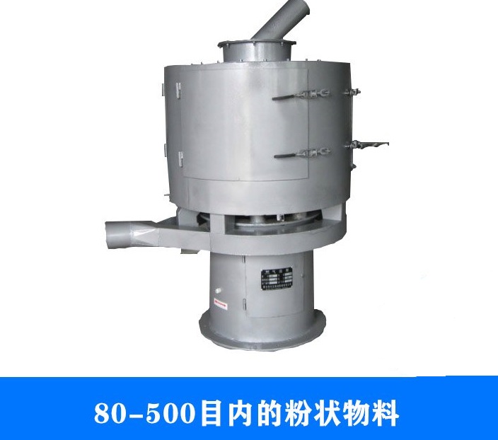 立式氣流篩分機(jī)外觀為立式,風(fēng)輪葉片密集、風(fēng)速高,向外噴射量大,產(chǎn)量比臥式氣流篩大,一般是礦產(chǎn)行業(yè)篩分粉料(重鈣粉等),要求被篩原料中細(xì)料90%以上,適用于細(xì)粉篩分,如面粉、石墨粉、橡膠粉、氧化鎂、珍珠巖粉、鐵粉、環(huán)氧樹脂粉等。但是立式氣流篩分機(jī)排料不方便,需要旋風(fēng)除塵器和布袋除塵器組合使用。