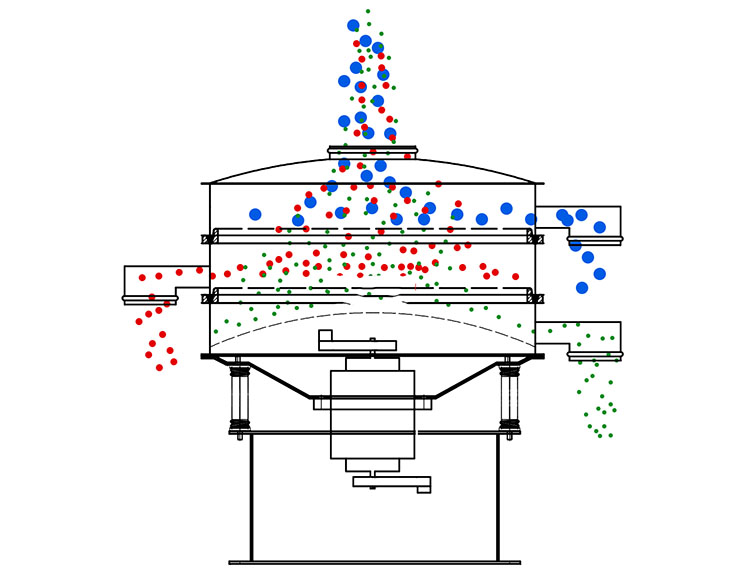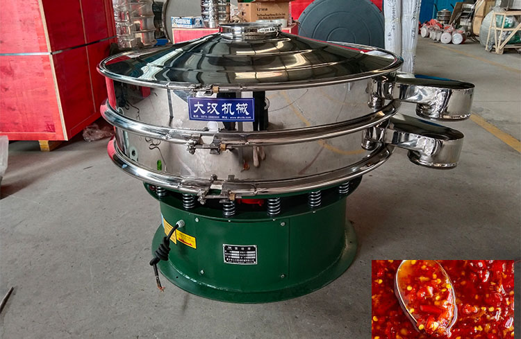 辣椒醬篩分機(jī)工作時(shí),辣椒醬從進(jìn)料口投入篩面,通過立式電機(jī)產(chǎn)生的振動(dòng)力,使辣椒醬在篩面上快速向四周擴(kuò)散,小于篩網(wǎng)孔徑的辣椒醬直接透網(wǎng),從下層出料口出料,被攔截在篩面上的大顆粒就沿著當(dāng)前篩面的出料口排出。